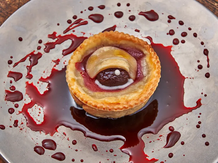 “These spooky cherry eyeball pies are the perfect creepy treat for your Halloween party. Made with store-bought pie crust and cherry pie filling, the mini pies are super easy to make and the eyeballs look scarily realistic. Serve in a ‘pool of blood’ for extra effect.” —Amanda Stanfield