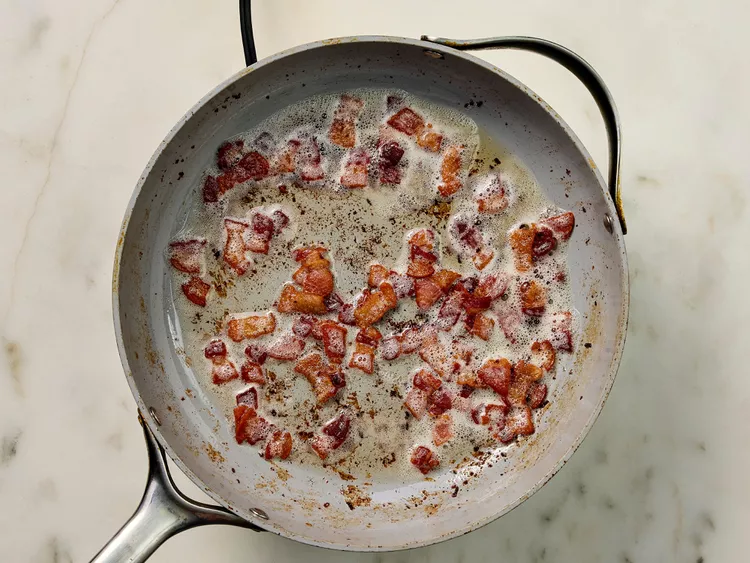 Cook bacon in a large skillet over medium-high heat, turning occasionally, until evenly browned, about 10 minutes. Transfer bacon to a Dutch oven with a slotted spoon. Reserve drippings in the skillet.