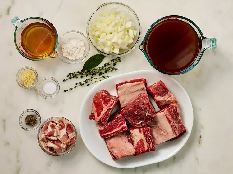 Heat drippings in the skillet over high heat; add short ribs. Cook until browned and caramelized on all sides, 3 to 5 minutes per side. Transfer ribs to a Dutch oven; reserve drippings in the skillet. Add thyme and bay leaf to the Dutch oven. Set aside.