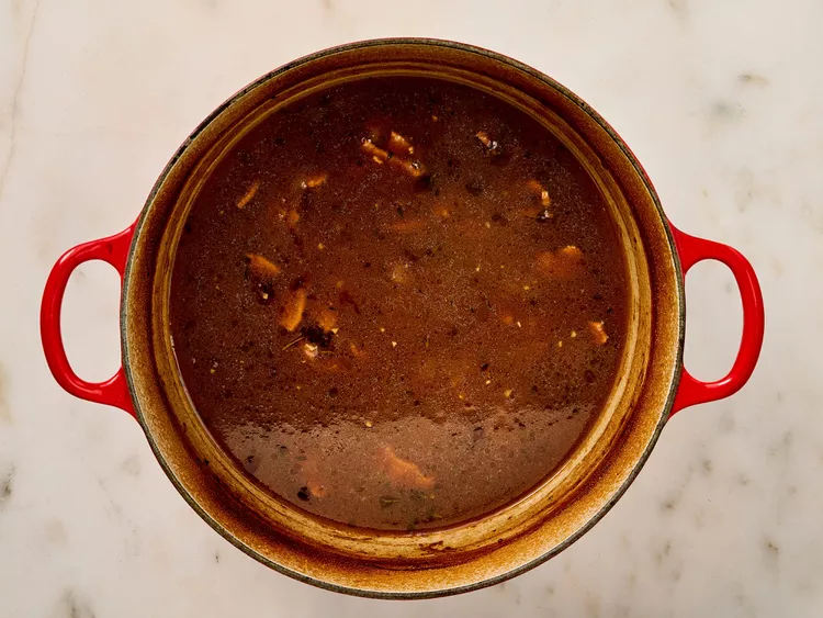 Pour sherry into onion mixture; cook until thick and hot, about 2 minutes. Pour onion-sherry mixture into the Dutch oven; add beef broth and season with salt. Bring to a simmer; cover the Dutch oven with a lid.